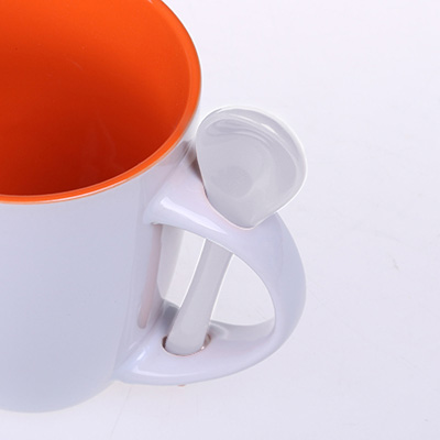 Kubek reklamowy z kolorowym wnętrzem i białym szkliwem na zewnątrz. W zestawie ceramiczna łyżeczka. Unikatowy kształt uchwytu ułatwia przechowywanie łyżeczki. Produkt jest końcówką serii, mogą na nim występować nakłucia, kropki oraz różnice w odcieniu szkliwa.