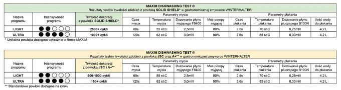 Wyniki testów trwałości nadruku, przeprowadzonych w profesjonalnych zmywarkach Winterhalter, nie mogą być bezpośrednio przenoszone na warunki domowe ze względu na znaczące różnice w typach urządzeń, cyklach mycia oraz stosowanych detergentach.